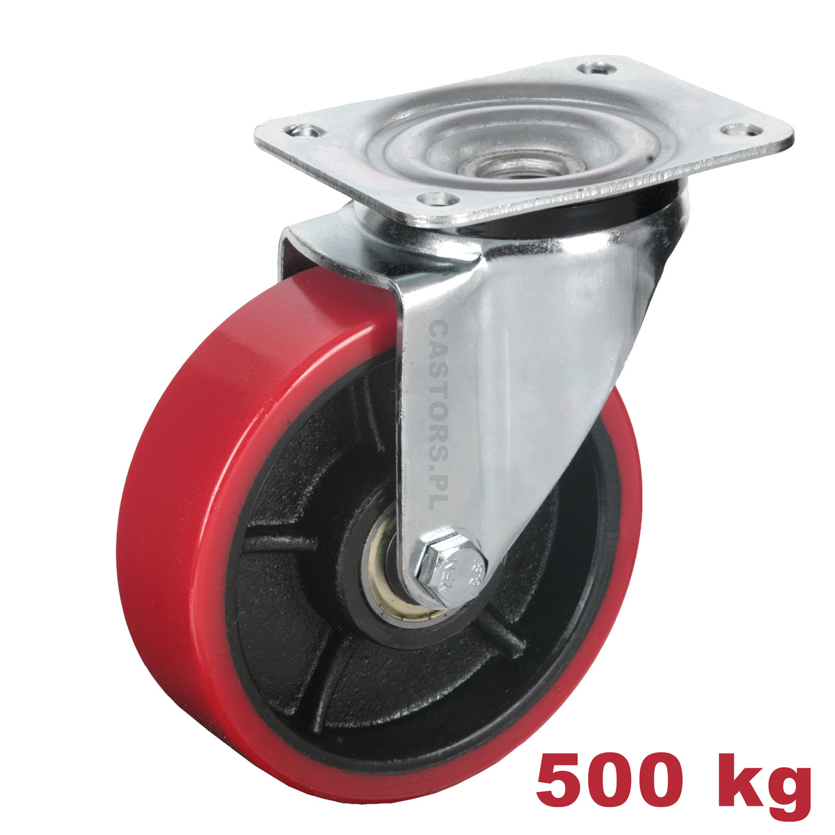 • Koło transportowe obrotowe w obudowie skrętnej. Do posadzek przemysłowych i innych równych podłóg. Płytka 135x110mm z czterema otworami o średnicy 11mm w rozstawie 105x80mm.Koło aluminiowe z oponką poliuretanową. Nośność 500 kg, Koło żeliwno-poliuretanowe