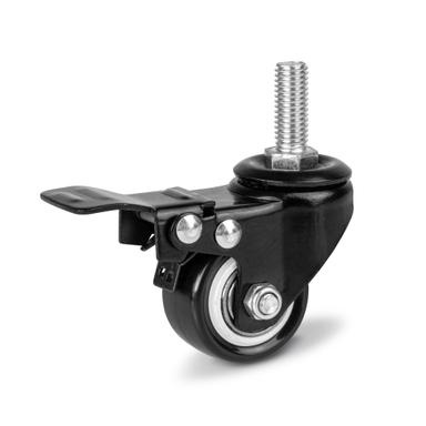 Wytrzymałe i lekkie koło skrętne wykonane z PVC, zaprojektowane z myślą o codziennym użytkowaniu w lekkich wózkach i urządzeniach transportowych, z możliwością blokady kierunku jazdy dzięki hamulcowi.